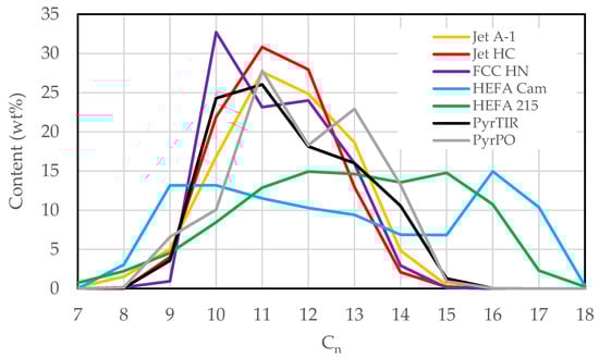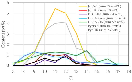 The total n-alkane content of each sample is given in the figure legend. It varied substantially from sample to sample. For samples representing the product of cracking technologies, i.e., hydrocracking (Jet HC, HEFA Cam and HEFA 215), catalytic cracking (FCC HN) and pyrolysis (PyrTIR), the n-alkane content was logically low because n-alkanes crack or isomerize. In the waste polyolefins pyrolysis (PyrPO) sample, n-alkanes were a dominant reaction product mainly for polyethylene cracking. For the Jet A-1 sample, the distribution of n-alkanes corresponded to their presence in straight-run kerosene because n-alkanes are not converted during hydrotreatment, and the concentration was the highest of all samples.
