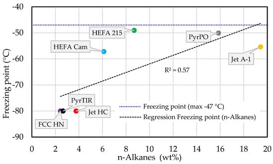 All components met the Jet A-1 freezing point requirements (max −47 °C, see the dotted line in Figure 5). For the three samples studied (Jet HC, FCC HN, and PyrTIR), the freezing point was not measurable by the method used (ASTM D5972); therefore, the value of −80 °C was considered. This may provide an incentive for further development of this method with respect to samples with low concentrations of n-alkanes (<4 wt%) or an extremely low freezing point (<80 °C). On the contrary, both HEFA samples had a relatively high freezing point despite their moderate n-alkane content (<9 wt%). This may be due to the presence of C15 and C16 n-alkanes in these samples. Although the statement that the freezing point increases with the n-alkane content was generally true for the samples studied, this relationship was not trivial, as shown by the low correlation coefficient R2 = 0.57 for the linear regression in Figure 5. Thus, the n-alkane content was not the only important factor in determining the freezing point of kerosene samples. Aromatics appeared to be another important factor in the behavior of the samples at low temperatures (Figure 6)