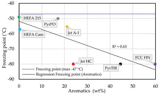 The freezing point of the samples decreased with increasing aromatics because the aromatics probably hindered the formation of n-alkane crystals. If aromatics were included as an additional variable in the multivariable linear regression, the value of the correlation coefficient improved significantly (R2 = 0.85). As the alternative components of jet fuel generally represent fractions of very different aromatic contents, this may be a subject of further research.