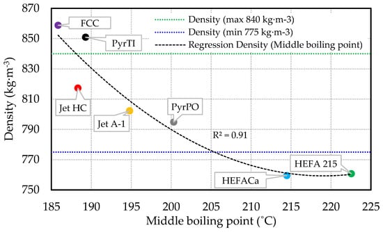 Although all of the samples studied met the distillation characteristics and the freezing point required for jet fuel, only three samples met, in principle, the basic density requirement. The density of both HEFA samples was too low due to the almost zero aromatic content, while for the PyrTIR and FCC HC samples, the density was too high, based on their high aromatics (see Table 1). Therefore, for the density of the samples studied, the group composition and aromatics were more important than the distillation characteristic (Figure 8).