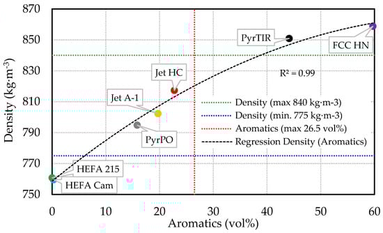 For the samples studied, the density relation to the aromatics was almost linear. The density increased with increasing aromatics. From the samples that did not meet the required density, the PyrTIR and FCC NH samples also did not meet the aromatics requirement. This signals that the use of some samples studied in jet fuel may be problematic because they did not simultaneously meet several critical parameters of jet fuel. However, there might be a possibility of blending samples that are on opposite sides of the density and aromatic spectra, which will be the subject of further research.