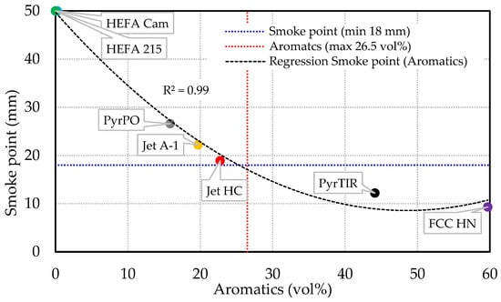 The aromatics in jet fuel are closely related to another specific qualitative parameter of this product—the smoke point. In general, the smoke point decreases with increasing aromatics []. Which of these characteristics limit the production of jet fuel at the oil refinery first always depends on the specific case. This dependence was investigated for the samples studied (Figure 9).