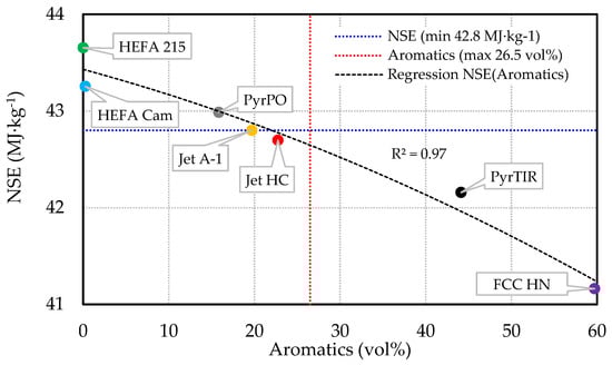 Relationship between measured net specific energy (MJ·kg−1) and aromatics of the samples studied.