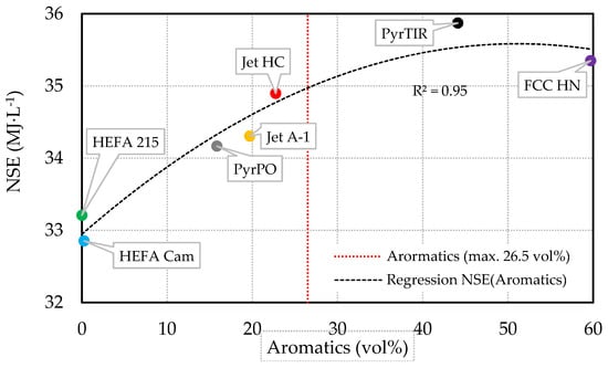 Relationship between measured net specific energy (MJ·L−1) and aromatics of the samples studied.