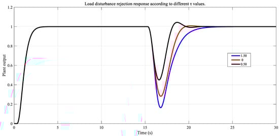 The load disturbance was investigated by taking 1.5θ, θ, and 0.5θ of τ. The load disturbance rejection response, according to these three values of θ, is shown in Figure 2.