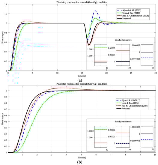 The proposed method was compared with the other methods in terms of parameter changes and time-delay changes. For this comparison, the time delay and process gain were increased by 10%, and each time constant was reduced by 5% [18]. Figure 6 presents graphs showing this comparison. The method proposed by Uma and Rao [16] produced unstable output for parameter values in these values, and for this reason, it is not shown in Figure 6. The result of the comparison indicates that the plant output designed using the proposed method is less affected by parameter changes in both reference tracking and load disturbance situations. This shows that the designed system is more robust.