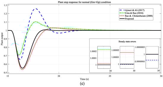 In the Figure 9b, it can be seen that the proposed method and Ajmeri and Ali’s [18] methods reach the reference value with no overshooting at approximately the same rise time. In this section, it can, again, be seen that the methods of Rao and Chidambaram [15] and Uma and Rao [16] are fast but exhibit very high overshoot rates. An input step disturbance value of −0.05 was applied to the system at t = 50, and the result obtained is shown in Figure 9c. It can be seen that the method proposed in our study can eliminate the disturbance input in the shortest time with negligible overshoot but with a little oscillation, whereas other methods can overcome this process with high overshooting and settling time. In terms of steady-state error, the method of Rao and Chidambaram [15] was shown to have the lowest value, and the proposed method is very close to this value, whereas the other methods exhibit a larger steady-state error.
