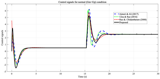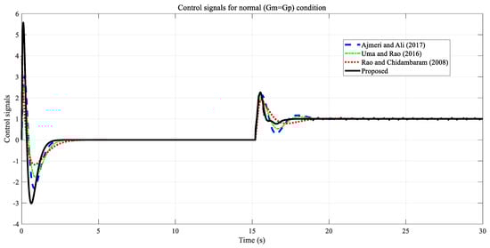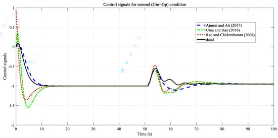 Control signals for the proposed method and the other methods are presented in Figure 10. As can be seen, an effort close to the control signal of Ajmeri and Ali [18] is applied on the set-point tracking side, and a higher control effort is exhibited in the methods of Rao and Chidambaram [15] and Uma and Rao [16]. On the disturbance rejection side, the lowest control effort is found in our recommended method. This result shows that the best control performance with low effort is obtained using the proposed method.