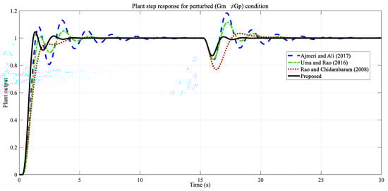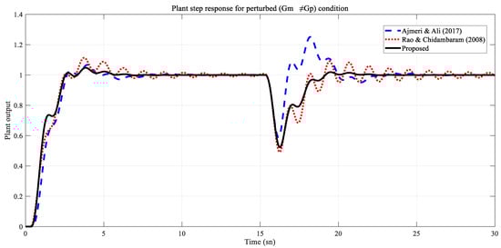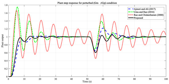 The controller parameters for this example are provided in Table 6. Here, comparisons are based on tests similar to those used in the two previous examples. An input step disturbance with an amplitude of −1 was applied to the system at 15 s. Plant parameters and time delay were increased by 20%. In this case, the perturbed model shown in Equation (26) was obtained as a result of the parameter change, and this model was used for the robustness comparison.