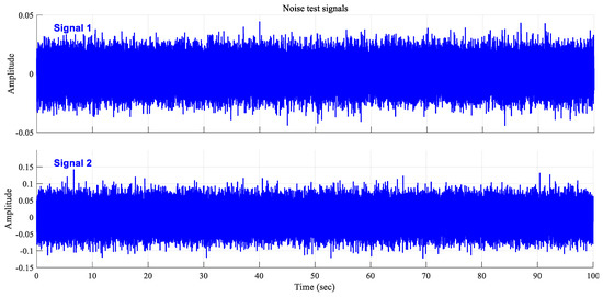 Noise is another issue to consider in process control applications. In processes, high-frequency signals in the feedback, due to the internal dynamics of the measuring elements or various electromagnetic effects, are characterized as noise. In many studies, additive Gaussian white noise (AWGN) has been used to simulate sensor noise [46,47,48,49,50]. The proposed method was also compared, in terms of measurement noise, with the methods of Ajmeri and Ali (2017), which are closest to the proposed method in terms of performance. For this purpose, two tests were carried out by adding white Gaussian noise to the system feedback in Figure 1. The used noise test signals are presented in Figure 7. Both test signals have a zero mean. The standard deviation of Signal 1 is 0.01 and the standard deviation of Signal 2 is 0.1. In noise tests, a low-pass filter is connected, in series, with the derivative operator in the controller on the load disturbance rejection side (Gc3) in the suggested method to keep the effect of noise to a minimum. The low-pass filter time constant (Tf) equals 0.05Td3. Test results for Example 1 are presented in Figure 8. Noise tests show both methods are affected by the noise situation. Although both methods can maintain their stability, it is seen that the plant output of the proposed method is less vibratory than the other method.