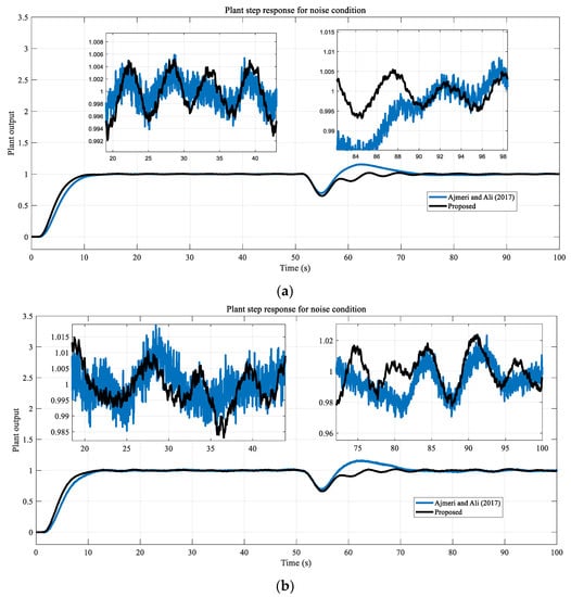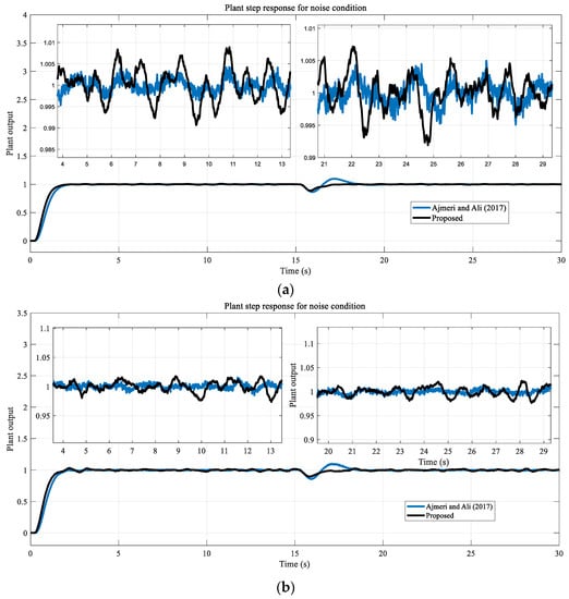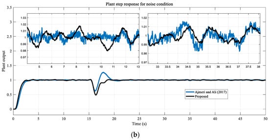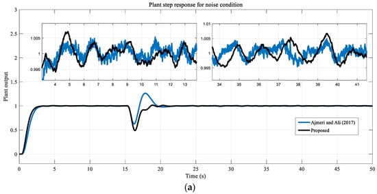 From the results shown in Figure 15, it can be seen that the proposed method maintains its robustness with parameter changes. The overshoot rate and oscillations increased in the methods of Ajmeri and Ali [18] and Uma and Rao [16]. In the method proposed by Rao and Chidambaram [15], some decrease in overshoot and a slight increase in settling time occurs. In our proposed method, the overshoot rate and oscillation increased slightly. Noise test results are presented in Figure 16.