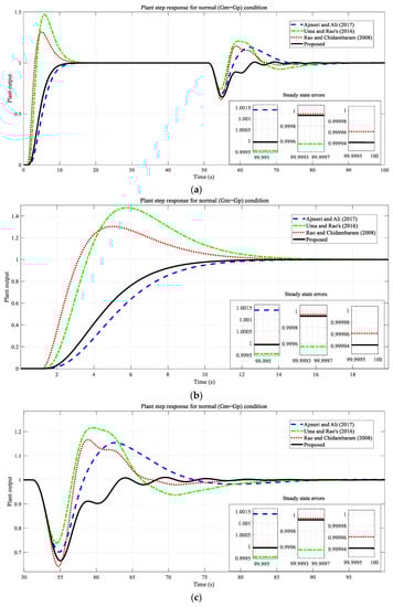 Other alternatives to optimization for controller design are classical analytical solution methods. In analytical solution methods, it is necessary to understand the mathematical model of the system to be controlled. Analytical methods are also carried out based on time-domain response or frequency-domain response properties. Most analytical designs use formulas for controller parameters, rise time, overshoot, settling time, and steady-state error values, which are the time-domain transient and steady-state characteristics of the system. Here, a desired reference output value of the system is known, and the controller parameters that can provide the transient and steady-state characteristics of this reference output are determined. Alternatively, the controller parameters can be understood by making use of the frequency characteristics of the specified reference model. In the direct synthesis (DS) method, the controller design is carried out over a plant model for which a closed-loop transfer function is sought [39]. In other words, the DS method relies on determining the desired system response and, then, identifying the controller parameters to provide that response. The controller parameters are determined by analytical processing using the process model and a desired closed-loop response. In this method, it is often assumed that the model of the controlled system is either known directly or is very well predicted. In this case, when the system parameters have not changed, it is referred to as the normal state. This process can be performed for a step reference and a disturbance input condition.