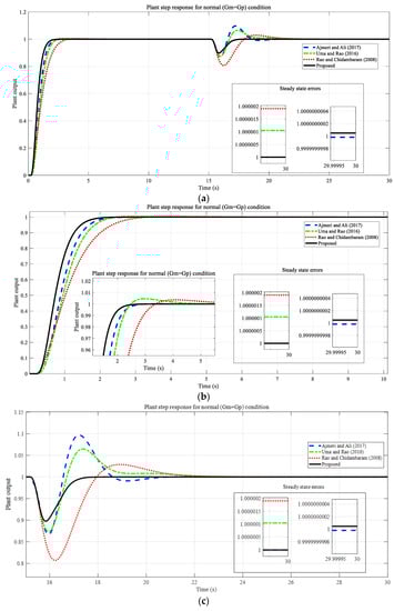 Closed loop performances of the proposed method and other methods for Example 3. (a) Set-point tracking and disturbance rejection, (b) magnified set-point tracking, and (c) magnified disturbance rejection [15,16,18].