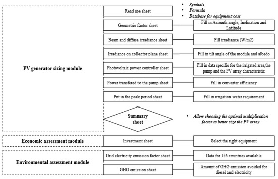 To make the proposed design techniques and optimization models more accessible, user-friendly tools have started to emerge. However, few tools have been developed in this context. Some authors have developed Excel-based tools for solar pumping system sizing. The Solar Water Pumping Worksheet by Jenkins and Bolivar-Mendoza [12] and the Toolbox on Solar Powered Irrigation Systems (SPIS), implemented by the German Agency for International Cooperation [13], are some examples. Both tools base the PV sizing methodology on daily average values of irrigation water requirements and irradiation for the day with the highest water demand, the former being applicable to any location, with the second one restricted to a specific area (New Mexico, Arizona, Colorado, Utah, Nevada, Wyoming, and Montana).