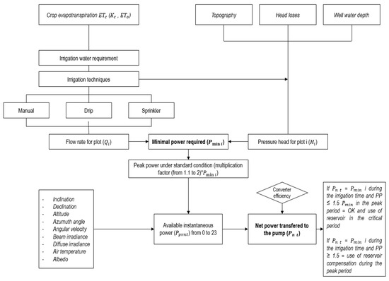 The peak power of the PV generator (PP, in W) is sized according to the most power-demanding sector of the farm, being then adjusted by means of a multiplication factor to mitigate the effect of the solar energy production curve. This multiplication factor ranges between one and two. An iterative process of simulation of the operation of the system for the whole irrigation season can be made by the user, allowing for the adjustment of the multiplication factor to increase its value (and so the peak power of the PV generator) when the irrigation is not fully satisfied (Figure 2). The system’s operation is simulated by estimating the PV power production potential of the plant throughout the day, based on Equation (1) [9,14]: