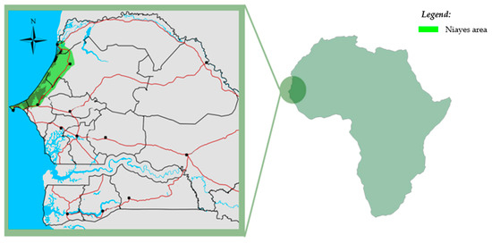 Nguethiouro was selected as a case study. This area is located in the Gandiolais region, at the southern end of the Senegal Delta (Figure 3). It is an integral part of the Niayes area, a coastal fringe, which extends from Dakar to Saint-Louis over a length of 180 km, with a width varying from 5 to 30 km [23].