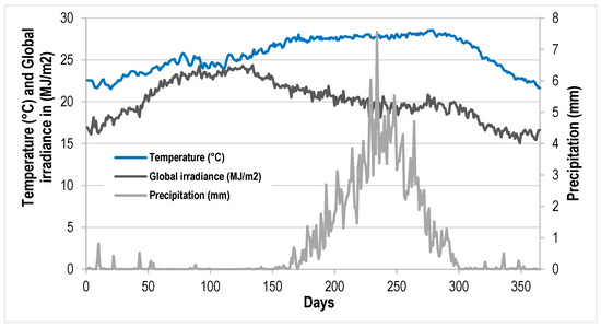 The Nguethiouro area is geographically localized between 16°28′30″ and 16°24′05″ W and 15°50′20″ and 15°56′10″ N, with Sahelian climate. It is characterized by an average annual rainfall of about 300 mm. Average annual temperatures range between 23.7 °C and 25 °C, while the highest average monthly temperatures range from 27.5 °C to 28.1 °C, occurring during the rainy season [24]. The mean daily global irradiance varies between 15 MJ/m2 and 23 MJ/m2. The highest value can achieve 28 MJ/m2 and may occur in August. Figure 4 shows the average variation of the daily mean values throughout the year for air temperature, global irradiance, and precipitation in the Nguethiouro lowland for the period 1990 to 2020.