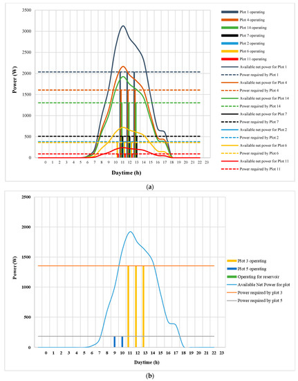 Figure 6 and Figure 7 show the irrigation scheduling for the peak period (4 July) for the different plots and sectors when the power provided by the PV plant is high enough to satisfy the irrigation time for each plot (or sector) during the whole irrigation season. This was possible for a multiplication factor of 1.4, so the power requirements for pumping were increased up to 3 kW for the most demanding plot, also considering the efficiency of the inverter.