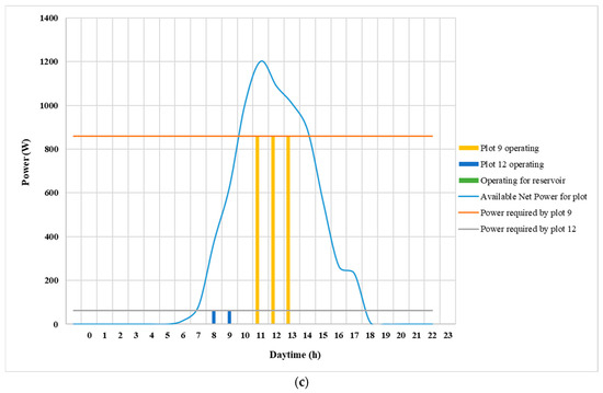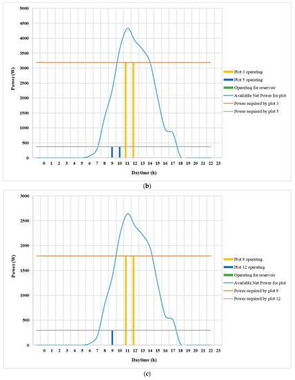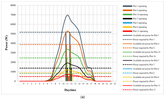 Figure 6 and Figure 7 show the differences in the irrigation scheduling when comparing manual irrigation with drip irrigation. Figure 7a shows that drip irrigation started at 11 a.m., finishing at 1 p.m. (2 h) for the plots that irrigate individually, as a higher power was required to operate compared to manual irrigation. In the case of Group 1 and Group 2, the results show that the most power-demanding plot of each group (Plot 3 and 9, respectively) started irrigating at 11 a.m., as in the case of the manual irrigation system, while the plots with lower power requirements were activated earlier in the morning (at 9 a.m.). In the case of the drip irrigation technique, the multiplication factor also equaled 1.4.