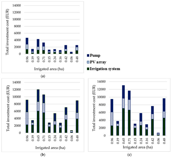 The ODSIS tool integrates a module for the estimation of the investment cost of the PV irrigation system. The investment cost calculations include the cost of the pump and the solar panels (including installation) and the cost associated to the irrigation system, including drippers or sprinklers, pipes, and filters. In this module, a partial calculation is possible for those farmers who already have an irrigation system and only need to replace the energy source. The total investment cost (TIC) is determined as a function of the unit price of the selected equipment (P, in EUR) and the number of units (i.e., number of PV panels, number of valves, etc.) or length (i.e., total pipe length for a specific diameter) (q) of the equipment and materials needed, as shown in Equation (13):