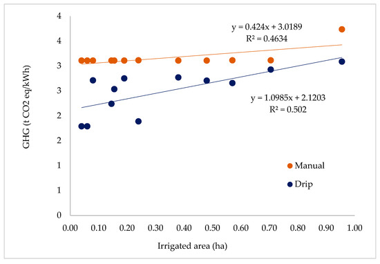 Irrigation water requirements varied depending on the irrigation system and crop (Table 1). Water requirements were higher when using manual irrigation systems, obtaining the lowest results for drip irrigation systems. This was due to the varying efficiencies for the different irrigation techniques for which an average value of 85% and 90% was applied for manual and drip irrigation, respectively [25].