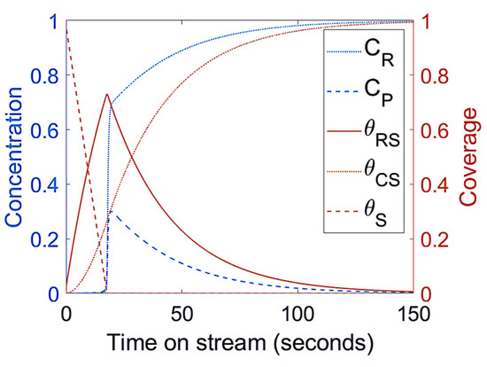 Estimated reactant and product concentration profiles (left axis) and surface species coverages (right axis) with respect to time for Mechanism I.