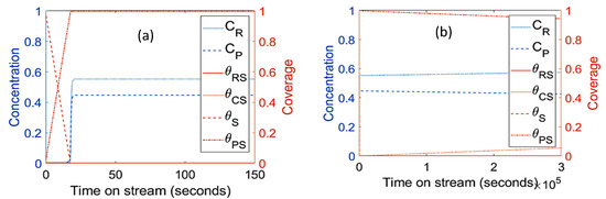 Estimated reactant and product concentration profiles (left axis) and surface species coverages (right axis) with respect to time for mechanism III at different scales of time on stream: (a) Short times on stream up to 150 s. (b) Large times on stream.