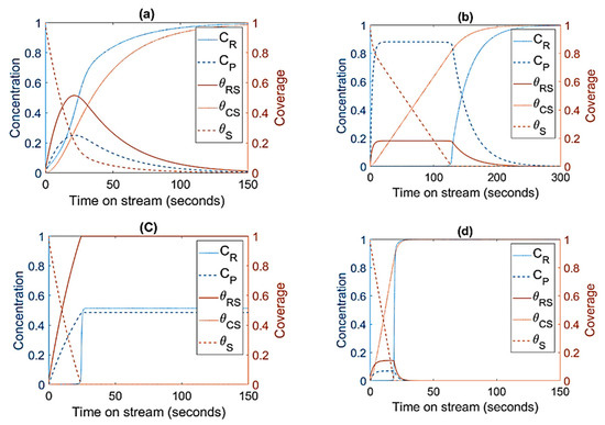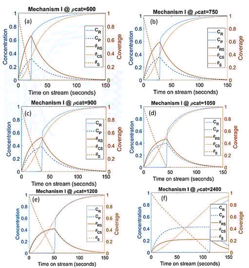 Figure 9. Estimated reactant and product concentration profiles (left axis) and surface species coverages (right axis) with respect to time: showing the effect of increasing catalyst amount. (a): ρcat = 600 g cm−3. (b): ρcat = 750 g cm−3. (c): ρcat = 900 g cm−3. (d): ρcat = 1050 g cm−3. (e): ρcat = 1200 g cm−3. (f): ρcat = 2400 g cm−3. - The parameters/variables values used for this modelling work were generated from the work of Sandelin et al. [4]. Their work is basically based on plug flow reactor whereas the present modelling is based on CSTR. The same principal shapes and types of step responses can be observed in both reactor types, CSTR and a plug flow reactor (PFR) [44]. The qualitative behavior of CSTR was reported to be very similar to this of PFR [44,45]. Surface species coverages were compared between PFR (the literature) and CSTR (present study) as part of the modelling validation (Figure 10). The same parameters/variables values were used in both cases. As shown in Figure 10, the principal shapes and types of steps responses are the same in CSTR and PFR confirming the validity of the CSTR modelling. In the two reactors, the coverage of n-pentene (A) rises rapidly from zero to a maximum value, and then starts to decline as the coverage of coke (C) increases with increasing time on stream. If k1 is decreased and k−1 is increased, the free vacant sites increase, especially in the beginning of the experiment. This trend can easily be seen for PFR (Figure 10c,d). When small changes occur, the responses in CSTR (as shown in Figure 10a,b) are less pronounced due to back mixing effects [44]. However, if k1 decreases up to a higher value (as shown in Figure 5a), the step responses can be more noticeable, similar to those observed in PFR. The differences observed are expected and are reported in similar comparison studies.