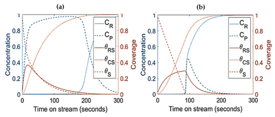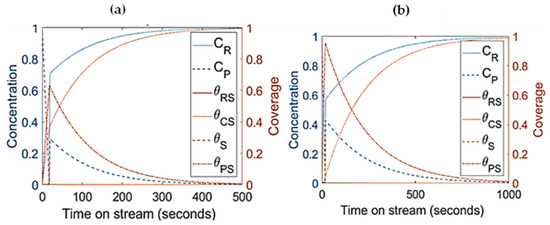 As shown in Figure 6a, was increased by 100% whereas is decreased by 10%, similar with the sensitivity analysis of mechanism I in the adsorption step. The results of these changes are very clear. The enhanced consumption of to produce the product has lowered the coke deposition and generally slowed down the deactivation. As seen in Figure 2, the full deactivation had occurred around 150 s whereas in Figure 6a the active sites are fully occupied by coke at around 250 s. Hence, speeding the product formation step has lowered the coke formation and reduced the severity of the deactivation on the catalyst.