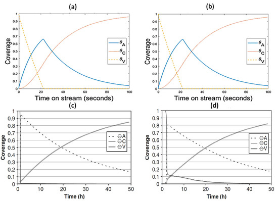 Figure 10. Estimated surface compound coverages: Comparison between CSTR (present study) and PFR (literature study), (a) mechanism I (elementary model, CSTR), (b) mechanism I (reduced k1 by 20% and increased k−1 by 10%, CSTR), (c) literature (elementary model, PFR), (d) literature (reduced k1 by 20% and increased k−1 by 10%, PFR.