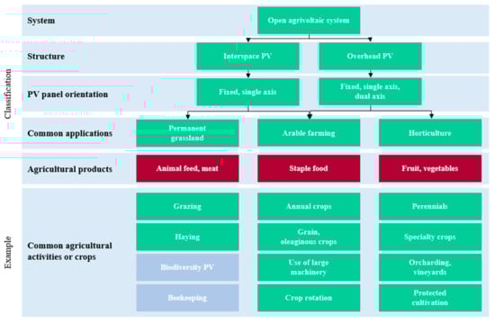 Agrivoltaic practices can be carried out in different ways depending on the activities carried out by the population in a given area (Figure 1). Agrivoltaic applications represent the combination of energy production with (i) agricultural production in the field or (ii) agricultural production in greenhouses or livestock rearing, or (iii) provision of ecosystem services through vegetation management or (iv) different agricultural practices combined [].