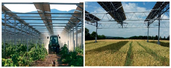 Several configurations and technologies have been developed and tested to optimize production in agrivoltaic systems. Therefore, the installation must meet the requirements of both the crop and the photovoltaic panels, which can be achieved by using optimal panel spacing and installation height that also allows the passage of agricultural machinery and appropriate panel technology []. Macknick et al. [] have identified three types of approaches for the implementation of agrivoltaic systems: (i) the energy production approach, which focuses on optimizing the solar energy produced (thus minimizing changes in standard solar development practices), while cultivating between and/or under the panels, (ii) the agricultural production approach which focuses on optimizing biomass production (minimizing changes in existing vegetation management activities), while taking energy production into account, and (iii) the integrated agricultural and energy production approach (incorporating vegetation and energy priorities into system design).