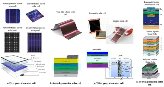 Solar cells can be grouped into four generations based on the specific constituent elements and their periods. The first generation of PV cells is based on silicon wafer technology, including monocrystalline and polycrystalline cells []. The cells have an efficiency of between 18% and 20%, depending on the quality of the silicon used. However, according to Blakers et al. [], the maximum efficiency reported for polycrystalline silicon cells could be as high as 26–27%. The theoretical maximum efficiency of monojunction silicon cells is around 30% and is called the Shockley–Queisser limit. The basic structure of these cells usually consists of a glass front and back cover, encapsulation layers, a solar cell matrix, and solder joints to electrically connect the individual cells []. Second-generation solar cells are thin-film cells that have a reduced maximum thickness of a few nanometers or tens of micrometers, compared to first-generation cells. This reduction in thickness helps to decrease the material usage and cost of silicon solar cells. These cells are made of two heterojunction layers squeezed between two contact layers. Efficiencies of 22.6% have been achieved with cadmium telluride (CdTe) thin films []. Third-generation cells consist of dye-sensitized solar cells (DSSCs), perovskite, and organic solar cells. DSSCs are limited by the synthesis of organic dyes and their chemical stability. For this reason, perovskite has been used as an alternative to DSSCs, and more than 21% efficiencies have been achieved in a very small area. The fourth-generation tandem solar cells are made of composite materials, consisting of polymers mixed with nanoparticles to have the properties of a single absorbing layer. The tandem solar cell is characterized by a top and bottom solar cell and an intermediate buffer layer. The upper GaAs cells absorb solar radiation, which is then transmitted to the Si of the lower cells []. The electrodes extract the generated charge carriers, and a photo-current flows through the thin buffer layer between the two solar cells []. The four generations mentioned are shown in Figure 9.