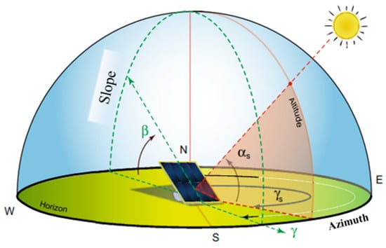 In particular, the electrical energy resulting from the transformation of the solar energy absorbed by the panels is strictly related to the slope (the tilt angle) and the azimuth angle []. The tilt angle (elevation angle) represents the angle formed by the horizontal plane of the installation and the PV panels for a fixed structure [,]. A change in the tilt angle simultaneously leads to a change in the amount of radiation reaching the surface of the PV panels []. However, as a general rule, the tilt angle for a PV array installation is nearly equivalent to the latitude of the area [,]. The solar azimuth is the horizontal angle between the vertical plane normal to the surface and the vertical plane in which the center of the solar disc is contained, oriented in the north–south direction []. For this purpose, the azimuth values of 90°, 0°, +90°, 180° correspond to the positions east, south, west, and north of the panels, respectively [,]. Thus, the panels are oriented to the north in the southern hemisphere and the south in the northern hemisphere [].