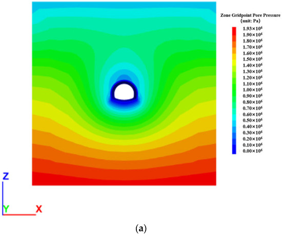 According to the displacement curve shown in Figure 9, the range and degree of displacement of the entire system are less when the drainage system is installed and functioning normally than when there is no drainage system installed in the tunnel. This indicates that the installation of a tunnel drainage system helps to control the displacement of both the surrounding rock mass and the tunnel lining. The presence of a tunnel drainage system benefits the formation of the pressure arch effect in deeply buried tunnels by lowering the pore water pressure near the tunnel, raising the effective tension of the surrounding rock mass and decreasing the deformation of the tunnel.