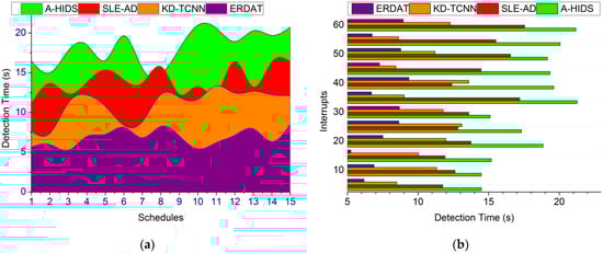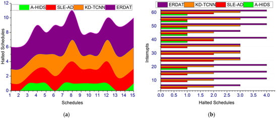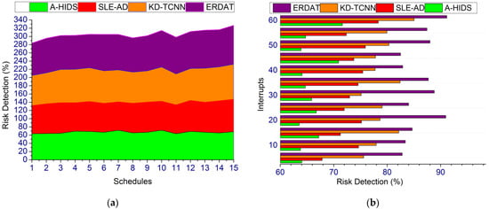 The discussion is presented using the metrics risk detection, outcome interrupt, halted schedules, max. interrupt span and detection time. The variants are schedules (up to 15) and interrupt (up to 60). The comparative methods are A-HIDS [23], SLE-AD [17], and KD-TCNN [18]. Compared to these methods, the introduced approach uses the fuzzy set and harmony optimization algorithm function which improves the overall risk identification and detection rate. In addition, fuzzy set and optimization problem solves the optimization problem and minimizes the detection rate.