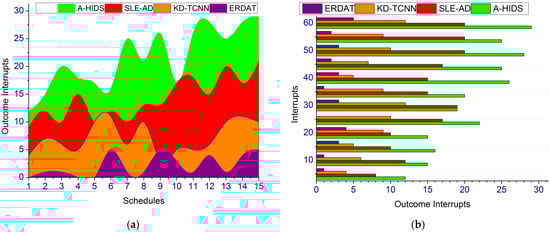 The risk is focused on Io devices or controllers or the monitoring systems . Based on the risk factor, is initialized that is handled under and . If the is high then is less, however, the variations are less for different operation levels. Therefore maximum is achieved as high compared to . At some time instance such as the n is also high. This indicates fewer outages for the varying processes. Based on the , the interrupt analyses are presented in Figure 8.