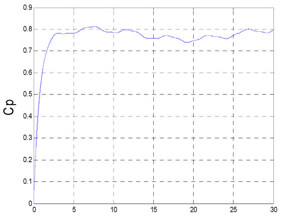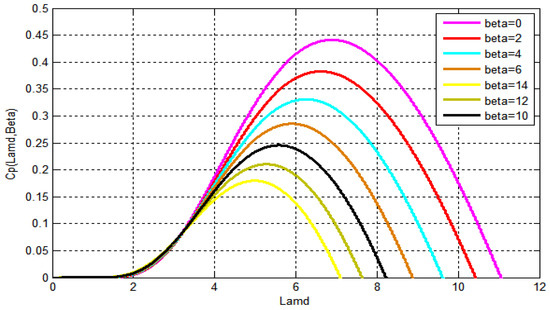where w denotes the wind turbine’s rotational speed. The link between the tip-speed ratio and the power coefficient Cp is seen in Figure 1. It should be observed that a value of is present to guarantee a maximum of Cp. Accordingly, it may be said that there is a turbine rotational speed value for a given wind velocity that permits obtaining the most mechanical power feasible from the wind, and this is precisely the turbine speed to be followed [20].