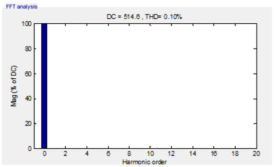 Additionally, the ripples of this voltage are quite tiny, and as seen in Figure 8, their harmonic spectrum exhibits a greatly decreased Total Harmonic Distortion (THD) of 0.10%. Additionally, this DC voltage maintains stability across the whole range of the wind profile fluctuation, ensuring a constant power flow between the grid and the generator’s rotor.