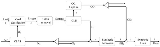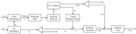 The main industrial route for urea production is initially producing ammonia and carbon dioxide from fossil energy (e.g., coal- and natural gas-based). As one of the main raw materials for synthesizing urea production, more than 80% of ammonia is used as nitrogen fertilizer [3]. Nearly all commercial production of ammonia is based on the Haber–Bosch synthesis process through the synthesis of N2 and H2 (N2/H2 = 1/3) at 450–600 °C and 10–250 bar [4]. The hydrogen is mainly derived from coal, natural gas, and other fossil fuels. The production of H2 mainly relies on coal and coke, and about 97% of H2 comes from these two feedstocks [5]. For the coal-to-hydrogen process, coal reacts with O2 to produce crude syngas, and after scrubbing and waste heat recovery, the crude syngas is delivered into the water–gas shift unit (WGS), in which CO and H2O are converted to CO2 and H2. Thus, a large amount of CO2 is generated in WGS [6,7]. In order to avoid the toxic catalyzer of NH3 synthesis, CO2 is split from the H2-rich steam in the acid gas removal unit (AGR). The AGR is a high operational cost unit mainly because a larger amount of energy is consumed.
