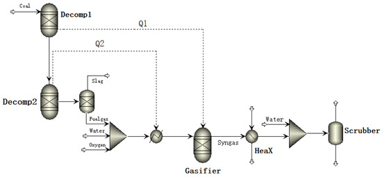 The process flowsheet of gasification is presented in Figure 4. The coal gasification process mainly includes coal water slurry preparation, gasification, waste heat recovery, and washing. In the preparation stage of coal water slurry, the raw coal is first crushed and pulverized and then mixed with water to obtain coal water slurry with coal to water ratio of 65% [29]. The Texaco coal-water slurry gasification technology is adopted. The coal slurry and O2 from CLASU enter the gasifier, where the water is rapidly vaporized and the partial combustion and devolatilization reactions begin to occur simultaneously. The generated crude syngas is cooled by water quenching method using the HeatX module to recover waste heat. After water quenching, the crude syngas enters the scrubber (flash model) to remove the soluble gas, and the crude syngas is further cooled and finally sent to the sulfur removal unit.