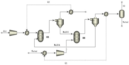 The schematic diagram of the CLAS process is shown in Figure 5. The CLAS process mainly includes oxidation reactor (OR) and reduction reactor (RR). Firstly, air is compressed by a compressor and heated up to reaction temperature; then, air is fed into the OR (RGibbs model), where Mn3O4 is converted to Mn2O3 by reacting with O2, as shown in Equation (6). The reaction product out of the OR enters the separator to separate oxygen-lean air and Mn2O3, and oxygen-lean air is used to provide N2 for the NH3 synthesis unit. In the RR, due to the low partial pressure of oxygen, steam needs to be introduced to promote the production of Mn3O4, and oxygen is by-produced in this process, as shown in Equation (7); Mn3O4 is then cycled back to the OR again. The O2 and steam out of the RR enter the separation unit, pure O2 is obtained, and O2 is required for coal gasification.