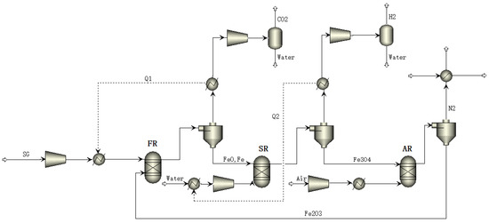 The main units of CLH process include a fuel reactor (FR), stream reactor (SR), and air reactor (AR). The circulating oxygen carrier (OC) is Fe2O3 with the inert material MgAl2O4 (70% wt.). Fe2O3 is selected because Fe2O3 has the advantages of being cheap and having high reactivity; moreover, Fe2O3 makes the water vapor has a high conversion rate [33,34,35]. Inert materials are used to control the temperature of the solids and reduce heat stress. In these sub-processes, the thermodynamic method of Peng–Rob is used for simulation.