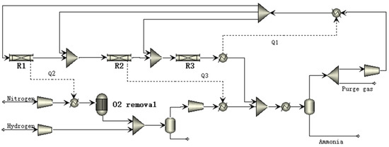 The flowsheet of the ammonia synthesis unit is shown as Figure 7. It mainly includes feed gas pretreatment, reaction, and purification parts. In the raw gas pretreatment stage, H2 and N2 are compressed and pressurized by the compressor and enter the catalytic oxidation reactor (Requil model); after removing a small amount of O2, the molar ratio of H2 and N2 is about 3, and they are then delivered into the dryer (Flash model). After removing the H2O in the mixed gas, the purified raw material gas passes and is compressed and enters ammonia synthesis reactors after passing through the heat exchanger. Since the synthesis ammonia reaction is exothermic, R1 can exchange heat with the feed N2, R2 pre-heats the cold feed, and the unreacted gas at the R3 outlet is mixed with the preheated feed. After the purified part of the unreacted gas and NH3 are further cooled by the heat exchanger into the flash tank (Flash model).