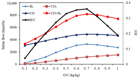 The O/C ratio is an important parameter for coal gasification due to the O/C ratio significantly affecting the flow and composition of produced crude synthesis. The effects of the O/C ratio on the gasifier performance (molar flow and H/C of crude syngas) are shown in Figure 9. In the range of 0.1–1.0, the molar flow of the components (H2 + CO) first increases as the O/C ratio increases and reaches the highest level (8158.88 kmol/h) when the O/C ratio is 0.7 and 0.31 is obtained for the H/C ratio. When the O/C ratio increases from 0.7 to 0.9, the molar flow rate (CO + H2) shows a downward trend, while the CO2 molar flow rate shows a rising trend because the high O/C means that the oxygen content entering the gasifier increases, and more CO reacts with O2 to generate CO2 in the gasifier. Therefore, 0.7 is suggested for the O/C ratio in this work.