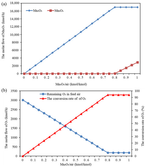 Effect of the Mn3O4/air ratio on the molar flow (a) Mn3O4 and Mn2O3, (b) O2 conversion and remaining O2 in feed air.
