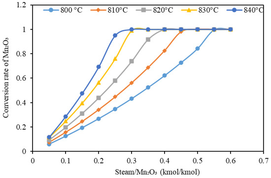 At the same temperature, the Mn2O3 conversion rate increases with the increase in the stream/Mn2O3 (S/Mn2O3) ratio. Under the same S/Mn2O3 ratio, the higher conversion rate of the Mn2O3 is achieved with increase in the reaction temperature, indicating that increasing the reduction temperature within a certain range can promote the reduction reaction. As the temperature changes from 800 to 840 °C, the steam/Mn2O3 ratio changes from 0.25 to 0.6 to maintain the Mn2O3 conversion at 95%. When the temperature is 830 °C and S/Mn2O3 is 0.3, the Mn2O3 conversion rate can reach 100%. In order to realize 100% of the Mn2O3 conversion and lower steam consumption, 830 °C and 0.3 are chosen for reaction temperature and S/Mn2O3 ratio, respectively, as shown in Figure 11.