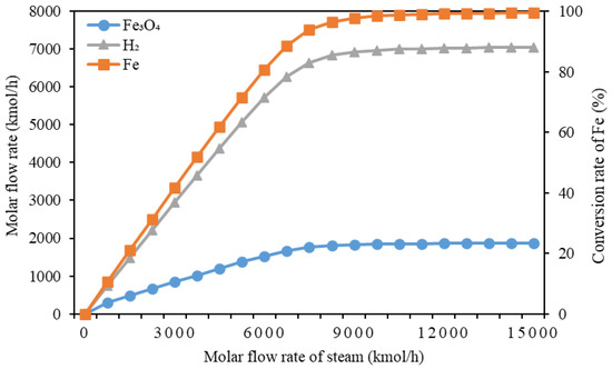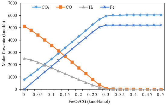Figure 12 shows the effect of the Fe2O3/CG on the molar flow rate. When Fe2O3/CG increases from 0 to 0.3, the molar flow rate of H2 and CO decreases with the increase in Fe2O3/CG. When Fe2O3/CG increases from 0.3 to 0.5, the molar flow rate of H2 and CO almost completely reacts with CO2. The molar flow rate of Fe increases with the increase in Fe2O3/CG. When Fe2O3/CG increases from 0.3 to 0.5, the molar flow rate of CO2 and Fe does not change. This is because when Fe2O3/CG is 0.3, the molar flow rate of H2 and CO in the reactor is very low, and the reaction reaches the limit. In this analysis, the molar flow rate of FeO is very low in the case of excessive syngas. According to Equation (14), the higher the molar flow rate of Fe is, the more favorable it is for H2 generation. Therefore, Fe2O3/CG is chosen as 0.3.