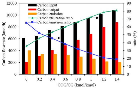 The carbon flow analysis is an important technical indicator for the COG-CTUCLAS&H and CTUCLAS&H processes [41]. The carbon utilization efficiency and CO2 emission rate are expressed in Equations (20) and (21).