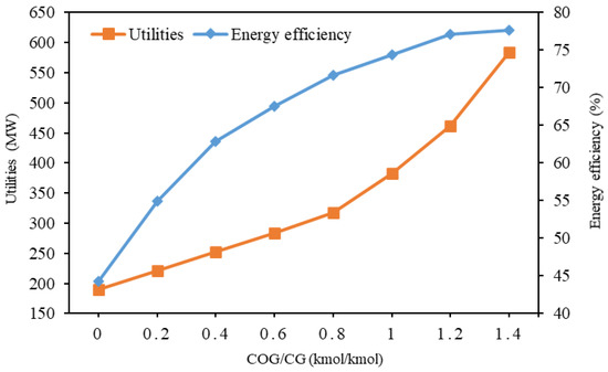 The energy efficiency is analyzed in this work, as shown in Figure 15. The minimal usage of utilities is obtained when the COG/CG ratio is 0, where the system energy efficiency is also the least (44.3%). At this time, H2 production in the system is insufficient, resulting in low urea production, and a large amount of CO2 is not used.